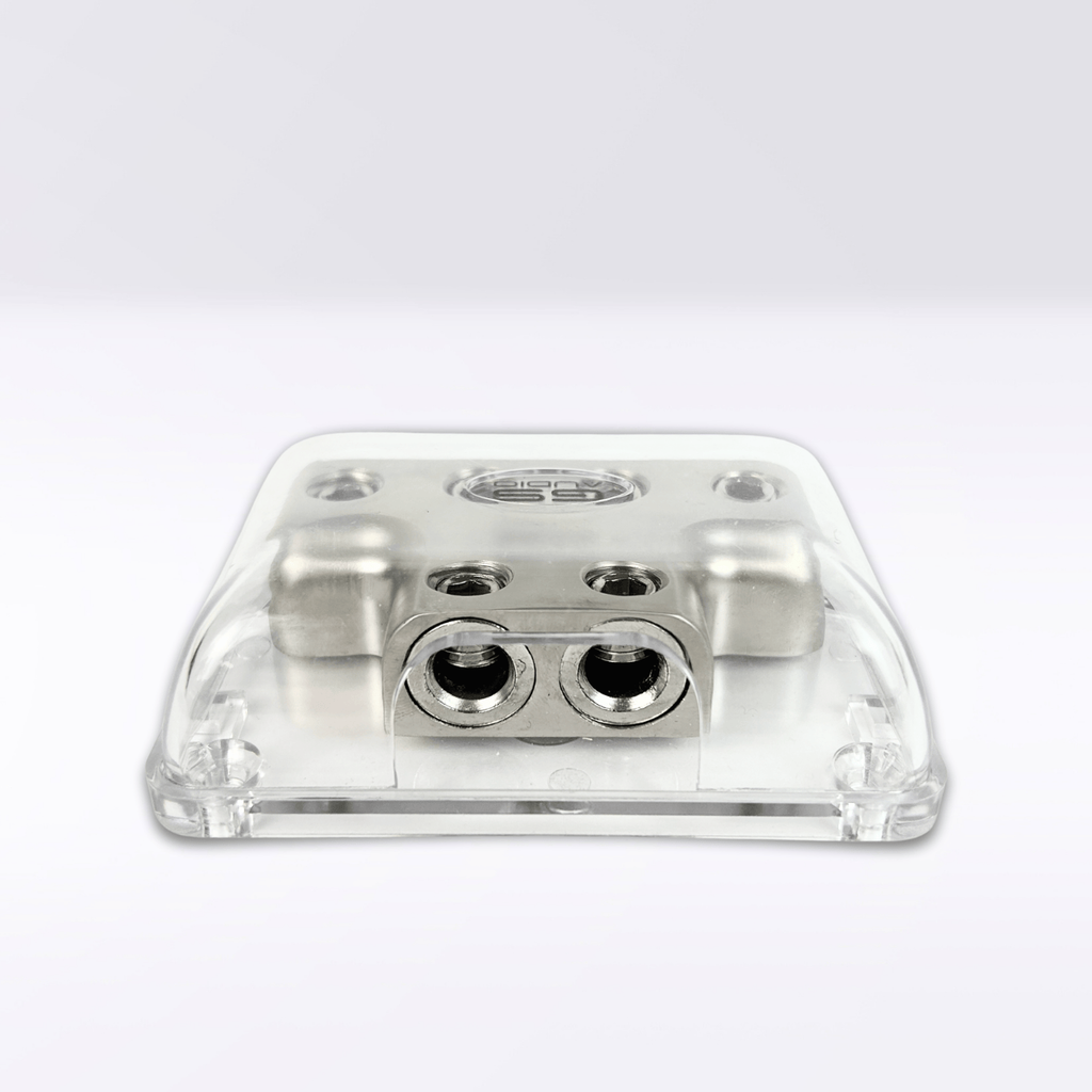 6-Way Power Distribution Block GS Audio | IN/OUT: 6x50/25Connections: up to 6 input or output connections of 50mmq (with reduction also 25mmq)6-way power distribution block, ideal for car hi-fi audio systems. Built with durable materials and plated contacts, ensures stable conduction over time. Deep housing design protects connections, while oversized screws ensure secure tightening even in harsh conditions. Reliable, practical and designed for professional installations. Key features:Type: 6-way power distribution blockCable compatibility: up to a maximum cross-section of 50mm² (25mmq reduction)Resistant to high temperaturesCover: shockproof clear plexiglass protective cover with engraved GS Audio logoMounting holes: prepared for secure mounting on panels or structuresUsage: Secure distribution for audio and vehicular electrical systemsApplications:Car audio systems (car hi-fi)Electrical systems on motor homes (RVs)ATV and off-road vehiclesNautical electrical systems (boats and boats)Safe power distribution to amplifiers and auxiliary devicesSystem protection from overloads and unstable connections