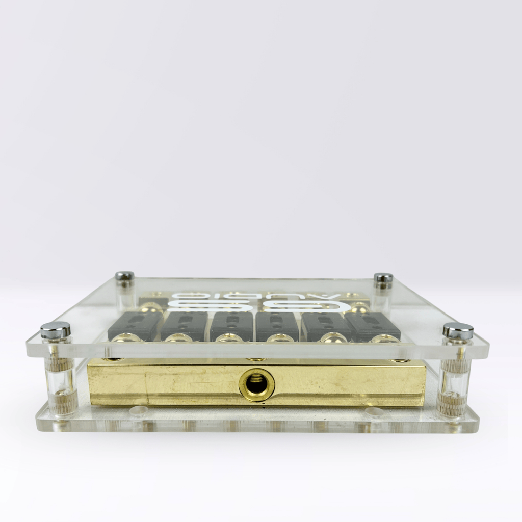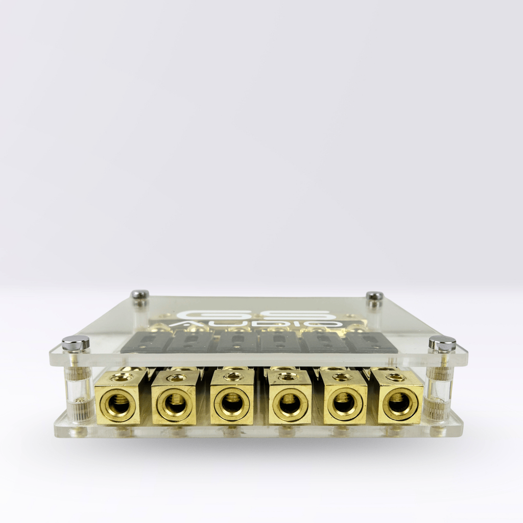 GS Audio ANL fuse holder IN:3x70 OUT:6x70 | Positive and Negative | 6-wayPositive fuse holder connections: 3 input connections (2 are on the side) for cables up to 70mmq (with reduction to 35mmq). 6 output connections for cables up to 70mmq (with reduction). Negative fuse holder connections: 3 input connections (2 are on the side) for cables up to 70mmq (with reduction to 35mmq). 6 outlet connections for cables up to 50mmq (with reduction). Fuses: 6 ANL 200A fuses.Configuration electrical: 6 ways in parallel via ANL fuses (6x200A).GS Audio professional fuse holder with separate handling for positive and negative. The positive section is equipped with 3inputs for cables up to 70 mm² and 6 outputs up to 70 mm². The negative section is equipped with 3 inputs for cables up to 70 mm² and 6 outputs up to 50 mm² . Ideal for high-power car audio systems or multi-battery configurations. Made with nickel-plated brass components, it provides resistance to oxidation and stable conduction over time. Transparent shockproof plexiglass cover with engraved GS Audio logo protects contacts from dust and accidental shocks. Fuses included in the package.Key features:Supported fuse type: ANLCable compatibility: up to a maximum cross section of 70 mm²Cover: shockproof clear plexiglass protective cover with engraved GS Audio logoMounting holes: prepared for secure mounting on panels or structuresIdeal for installations with multiple power lines or dual battery systemsElegant and striking look thanks to gold-colored finish: definitely won't go unnoticed, perfect for installations to show off. Applications:High-power car audio systemsConnection between batteries or LTO/LiFePO4 banksInstallations on RVs, industrial and marine vehiclesProtection of main power supplies or lines from oversized alternators Need more fuses? Purchase them on our website, available ANL up to 600A and AFS up to 150A