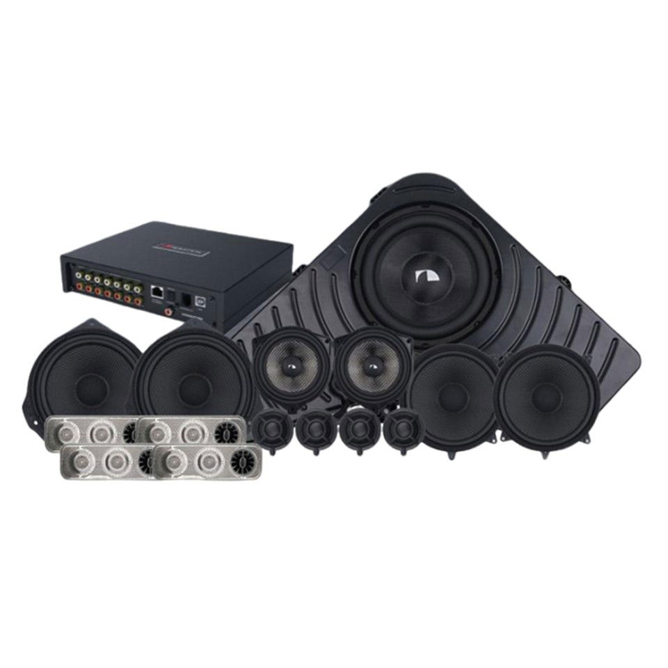 6,5-tums mellanbas-högtalarna är placerade i fram- och bakdörrarna och levererar 40W effekt och ett frekvensomfång från 60Hz till 7kHz. De använder en högupplöst vävd fiberkon för tydlig och balanserad ljudåtergivning. Ett par 3,5-tums mellanregisterhögtalare i kolfiber sitter i centerkanalen för att förbättra ljudbalansen, medan de 1,5-tums diskanterna sträcker sig upp till 20kHz och ger ett klart och detaljerat ljud utan att bli påträngande.